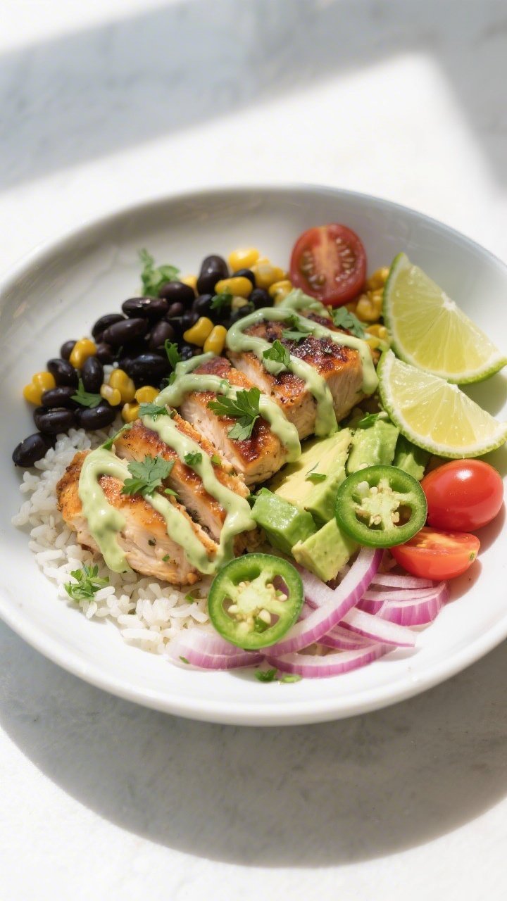 6. Assemble the bowls: Add a scoop of rice or quinoa to each bowl. Top with chicken, black beans, corn, tomatoes, red onion, and avocado. Drizzle with the avocado-lime sauce and scatter cilantro on top. Serve with lime wedges.