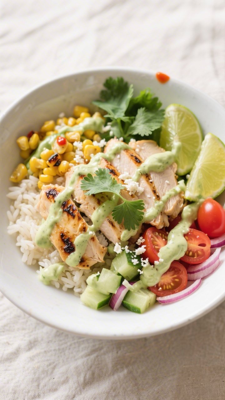 Keep grains, chicken, veggies, and sauce in separate containers if you plan to meal prep. Assemble right before eating so the textures stay crisp and vibrant. For warm bowls, reheat the chicken and grains, then top with cool veggies and sauce.