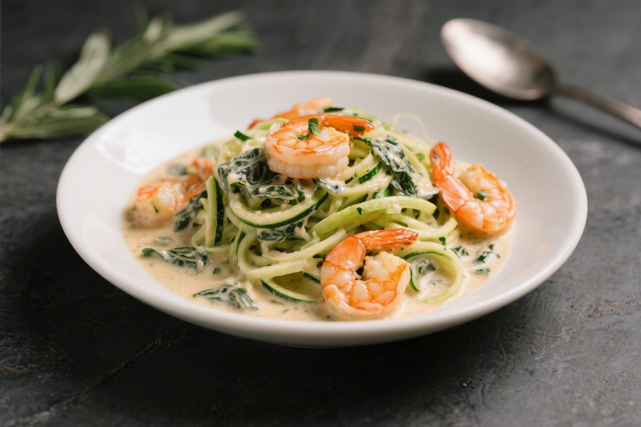 Close-up detail: Glossy, cream-coated shrimp nestled with ribbons of sautéed zucchini noodles in a Save